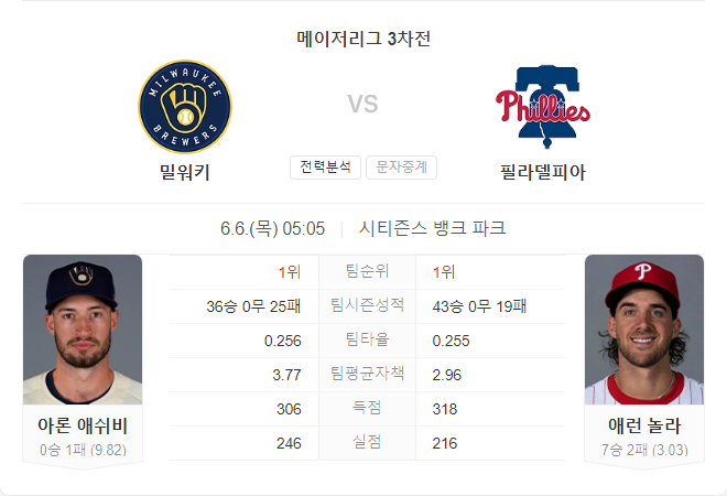 필라델피아 필리스는 애런 놀라의 안정적인 투구와 강력한 타선으로 밀워키 브루어스를 상대로 우위를 점할 가능성이 큽니다. 브루어스는 불펜의 불안정함과 상대적으로 낮은 삼진율로 인해 필리스의 강력한 타선을 막기 어려울 것으로 보입니다.