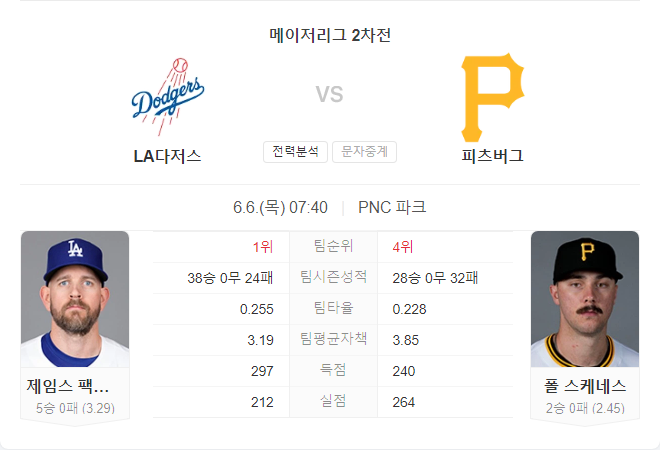 폴 스켄스는 신인 투수로서 첫 번째 시즌을 성공적으로 시작했으며, LA 다저스와의 첫 맞대결에서 그의 놀라운 구위를 선보일 것으로 기대됩니다. 제임스 팩스턴도 올 시즌 안정적인 투구를 보여주고 있지만, 다저스의 불펜이 다소 불안한 상태입니다. 피츠버그의 타선이 조금 더 강력할 것으로 예상되며, 스켄스의 깜짝 활약이 큰 변수가 될 수 있습니다.