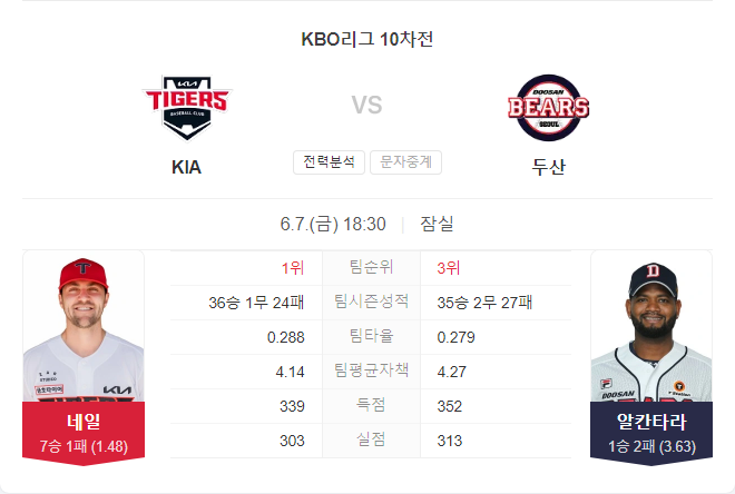 기아 타이거즈는 제임스 네일(7승 1패, ERA 1.48)을 선발로 내세워 시즌 8승에 도전합니다. 1일 KT와의 홈 경기에서 7이닝 3안타 1실점으로 호투하며 승리를 거둔 네일은 최강의 투구를 보여주고 있습니다. 5월 26일 두산과의 홈 경기에서도 6이닝 1실점으로 호투하며 승리를 거두었고, 두산 상대로 점점 더 좋은 투구를 선보이는 점이 긍정적입니다.