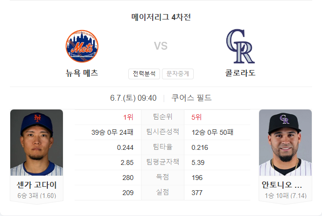 이번 경기 선발은 고다이 센가입니다. 올 시즌 6승 3패, 평균자책점 1.60, WHIP 1.18, 62이닝 59탈삼진을 기록하며 리그 정상급 투구를 이어가고 있습니다. 특히 장타 허용률이 낮고, 헛스윙을 유도하는 능력이 뛰어나 타격 부진이 극심한 콜로라도를 상대로 유리한 고지를 점할 수 있습니다.