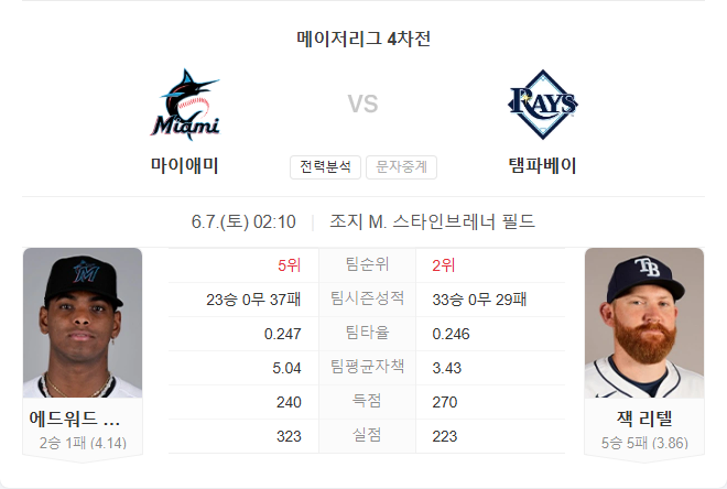 말린스는 카브레라가 5월 들어 안정적인 투구를 이어가고 있으나, 타선의 침묵과 최근 팀 분위기 침체가 발목을 잡고 있습니다. 반면 레이스는 최근 10경기에서 7승을 거두며 타격과 마운드 모두에서 안정된 전력을 유지하고 있고, 리텔의 완투 경험은 이번 경기에서 큰 자신감으로 작용할 수 있습니다. 홈경기 장소가 바뀐 상황에서도 레이스는 적응을 마친 듯하며, 현재 기세를 고려할 때 우위를 점할 가능성이 높습니다.