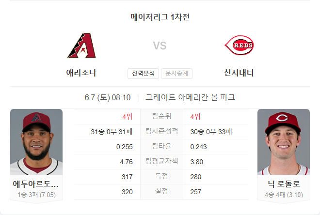 6월 7일 MLB 메이저리그 애리조나 다이아몬드백스 VS 신시내티 레즈 타카짱의 경기 예측 분석