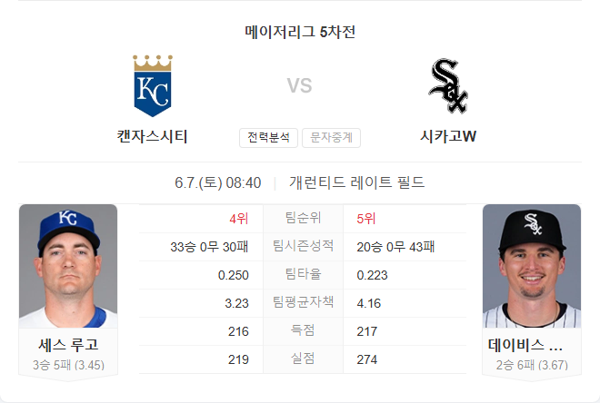 6월 7일 MLB 메이저리그 캔자스시티 로열스 VS 시카고 화이트삭스 타카짱의 경기 예측 분석