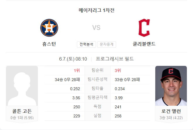 두 팀 모두 타선이 다소 저조한 흐름이지만, 클리블랜드는 홈에서 강한 투수력과 짜임새 있는 수비로 경기를 운영할 수 있습니다. 고든과 앨런 모두 기복이 있지만, 로건 앨런은 최근 등판 간격이 길어 휴식 후 반등 가능성이 있습니다. 휴스턴은 고든이 아직 승리를 기록하지 못한 점과 타선의 침묵이 변수로 작용할 전망입니다. 홈팀 가디언스가 리드 흐름을 잡으며 승리를 거둘 가능성이 높습니다.