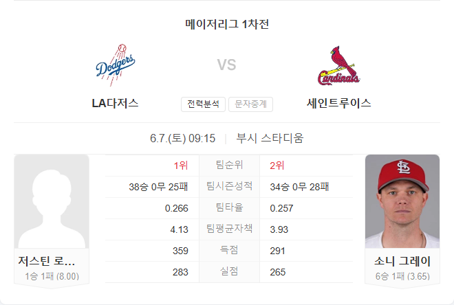선발투수는 소니 그레이로, 시즌 6승 1패, 평균자책점 3.65를 기록 중입니다. 직전 경기에서는 텍사스를 상대로 7이닝 무실점, 10탈삼진을 기록하며 압도적인 투구를 선보였습니다. 최근 3경기에서는 평균자책점 1.42, WHIP 0.947로 더욱 안정적인 모습을 보이고 있습니다. 다저스를 상대로는 통산 1승 4패, 평균자책점 3.35를 기록하고 있으나, 홈구장인 부시 스타디움에서는 3.01 ERA와 198탈삼진을 기록하며 강한 면모를 보여왔습니다.