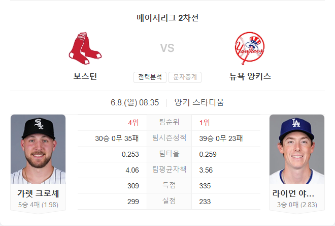 보스턴은 크로셰라는 강력한 선발 카드를 내세우지만, 최근 불안한 불펜과 극심한 연패 흐름을 고려하면 이 경기에서 반등을 기대하긴 어려워 보입니다.