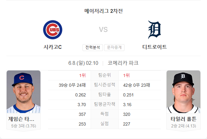 양 팀 모두 디비전 선두권을 유지하고 있어 경기의 중요도는 매우 높습니다. 타이욘은 뛰어난 제구력과 낮은 WHIP을 바탕으로 안정적인 투구를 이어가고 있으며, 최근 상승세인 타선의 도움을 기대할 수 있습니다. 반면 몬테로는 피안타율과 WHIP 수치가 다소 불안하며, 장타력이 좋은 컵스 타선을 상대로 고전할 가능성이 큽니다. 양 팀 불펜 모두 부상 이탈자가 있어 선발 싸움의 중요성이 더욱 커지는 경기입니다.