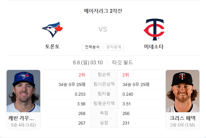 6월 8일 MLB 메이저리그 토론토 블루제이스 VS 미네소타 트윈스 타카짱의 경기 예측 분석
