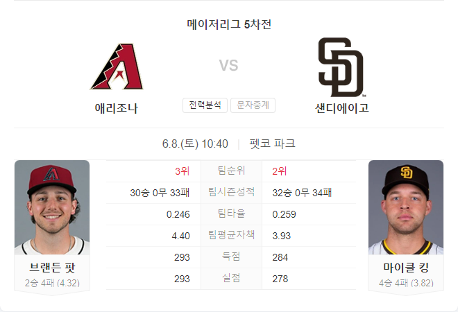 애리조나 다이아몬드백스는 브랜든 파팃의 안정적인 투구와 강력한 타선을 앞세워 승리를 노리고 있습니다. 반면 샌디에이고 파드리스는 마이클 킹이 최근 안정적인 투구를 보여주고 있지만, 타선의 지원이 필요합니다.