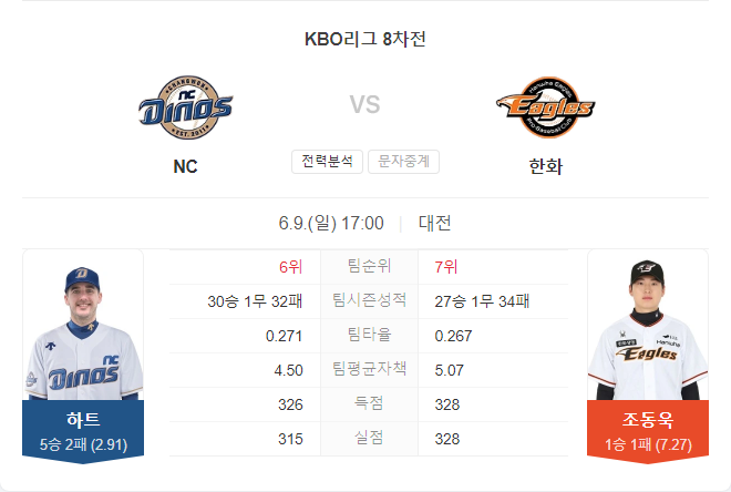 6월 9일 KBO 프로야구 NC 다이노스 VS 한화 이글스 타카짱의 경기 예측 분석