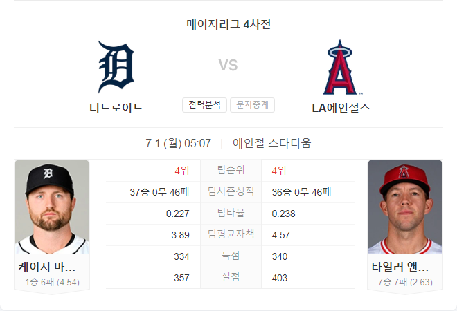 7월 1일 MLB 디트로이트 타이거즈 VS LA 에인절스 타카짱의 경기 예측 분석