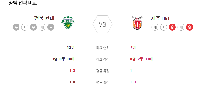 7월 10일 K리그 전북 VS 제주 타카짱의 경기 예측 분석