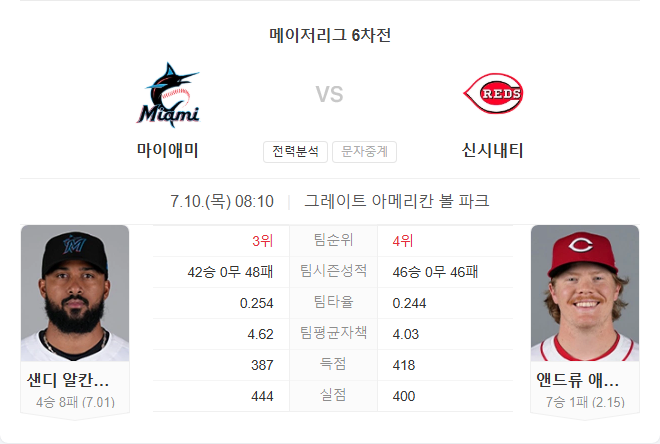 최근 흐름만 놓고 보면 말린스가 우세합니다. 하지만 마운드에서 알칸타라가 불안정한 반면, 애벗은 압도적인 경기력을 보이고 있습니다. 레즈 타선이 알칸타라를 초반에 공략한다면, 홈 이점을 살려 분위기를 바꿀 가능성이 큽니다. 하지만 말린스는 이번 시즌 레즈와의 맞대결에서 4승 1패로 강세를 보이고 있어 접전이 예상됩니다.