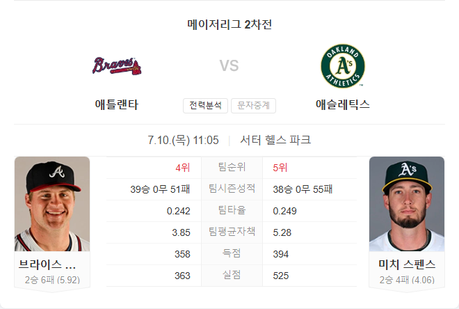 양 팀 모두 순위가 하위권에 머무르고 있으나, 현재 분위기는 애슬레틱스가 우위입니다. 홈에서의 경기를 치르는 애슬레틱스는 최근 투타 밸런스가 맞춰진 모습이며, 브레이브스는 선발과 불펜 모두 흔들리는 흐름을 보이고 있습니다. 엘더가 마운드에서 버티기 어렵다면 중반 이후 격차가 벌어질 가능성도 있습니다. 애슬레틱스가 연승 기회를 잡을 수 있는 좋은 경기입니다.