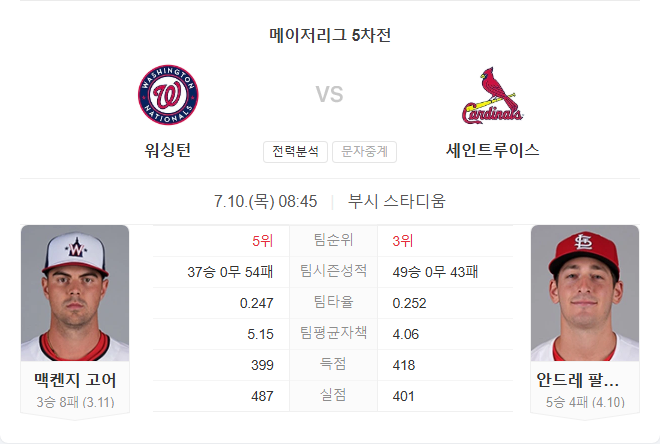 양 팀 모두 마운드가 불안한 상태지만, 홈에서 강한 카디널스가 좀 더 유리한 상황입니다. 팔란테는 안정감 있는 피칭을 바탕으로 내셔널스 타선을 막을 가능성이 있으며, 시즌 맞대결 전승이라는 심리적 우위도 존재합니다. 내셔널스는 매켄지 고어의 호투에 기대야 하는데, 득점 지원이 부족한 점이 발목을 잡을 수 있습니다.
