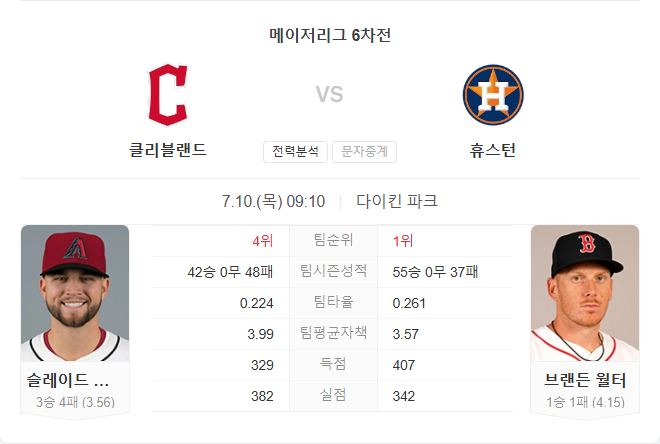 클리블랜드는 최근 극심한 타격 부진과 연패 흐름으로 인해 경기 주도권을 잡기 어려운 상황입니다. 반면 애스트로스는 꾸준한 타격과 홈에서의 강세, 안정적인 불펜 운영으로 우위를 점하고 있습니다. 선발 월터 역시 무난한 피칭을 이어가고 있어 가디언스 타선을 무력화할 가능성이 높습니다. 전력 차이를 고려할 때 휴스턴이 경기를 무난하게 가져갈 것으로 보입니다.