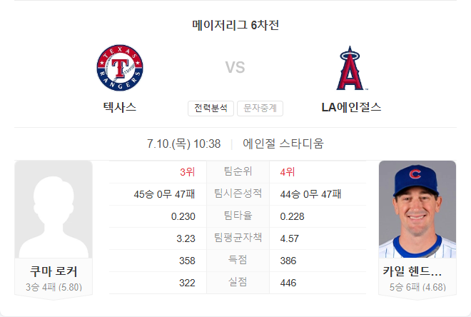 양 팀 모두 시즌 중반을 지나며 플레잉오프 경쟁권 근처에 머무르고 있으나, 텍사스는 시즌 상대 전적에서 4승 1패로 우위를 점하고 있습니다. 록커의 기복이 변수이지만 최근 상승세와 타선의 집중력이 뒷받침된다면 경기 주도권을 잡을 가능성이 큽니다. 에인절스는 홈 이점을 살리기 위해 선취점을 노리는 전략이 중요할 전망이며, 헨드릭스의 안정감이 변수로 작용할 수 있습니다.