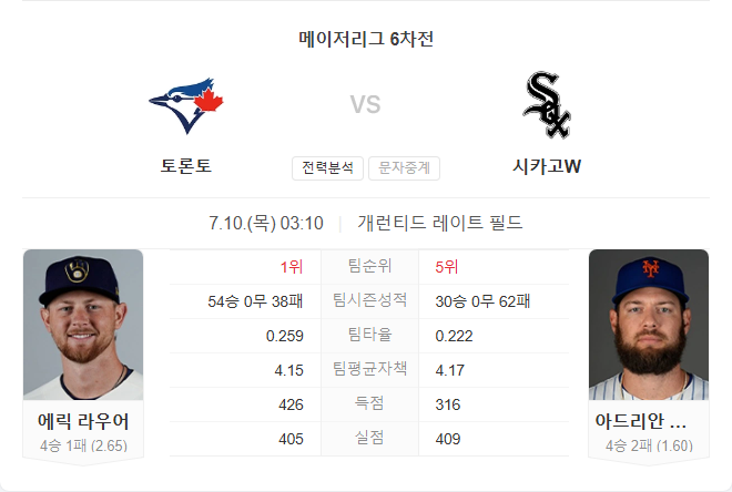 7월 10일 MLB 메이저리그 토론토 블루제이스 VS 시카고 화이트삭스 타카짱의 경기 예측 분석