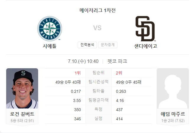 이번 경기는 시애틀 매리너스가 우위를 점할 것으로 보입니다. 로건 길버트가 팀의 유일한 올스타로, 시즌 ERA 2.91을 기록하며 뛰어난 활약을 펼치고 있기 때문입니다. 반면, 샌디에이고 파드리스의 아담 마주르는 시즌 ERA 7.52로 다소 불안한 모습을 보이고 있습니다. 매리너스는 최근 5경기 중 4경기에서 승리를 거둔 길버트의 안정적인 투구에 힘입어 이번 경기를 승리로 이끌 가능성이 높습니다.