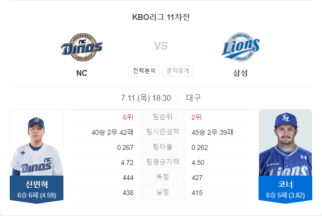 이번 경기는 NC 다이노스가 우세할 것으로 예상됩니다. 다이노스는 최근 좋은 성적을 유지하고 있으며, 강력한 공격력을 바탕으로 삼성 라이온즈를 압도할 가능성이 큽니다. 반면, 삼성 라이온즈는 최근 부진한 성적을 기록하며 어려움을 겪고 있어 이번 경기에서도 어려움을 겪을 것으로 보입니다.