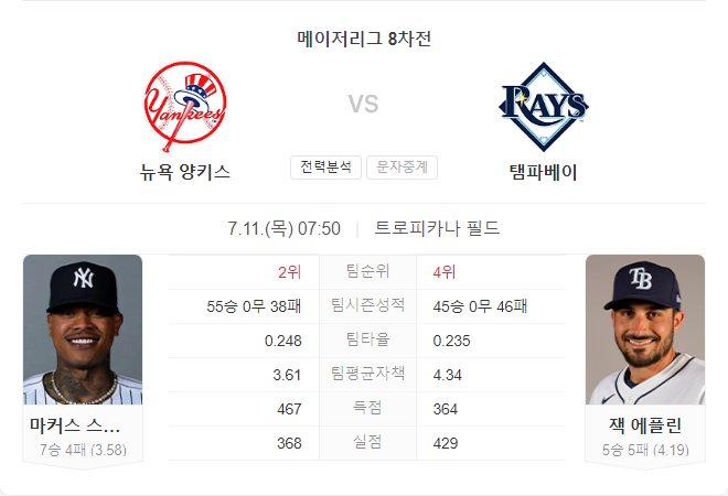 7월 11일 MLB 뉴욕 양키스 VS 탬파베이 레이스 타카짱의 경기 예측 분석