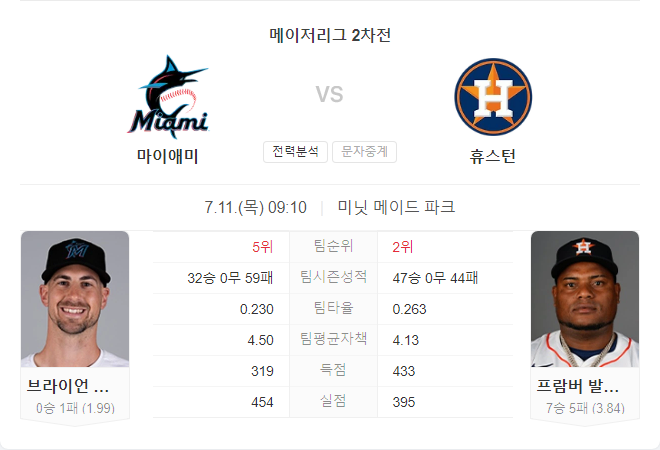 마이애미 말린스는 최근 원정 경기에서 두 번의 패배를 기록했으며, 공격력이 부진한 상황입니다. 휴스턴의 로넬 블랑코는 최근 홈 경기에서 안정적인 투구를 보여주고 있어, 마이애미의 공격을 효과적으로 봉쇄할 것으로 예상됩니다. 따라서 휴스턴 애스트로스가 이번 경기에서 승리할 가능성이 큽니다.
