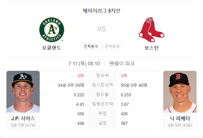 보스턴 레드삭스는 최근 6승 1패의 상승세를 타고 있으며, 홈에서도 강한 모습을 보이고 있습니다. 팀 전체적으로는 시즌 초반에 비해 꾸준한 성적을 유지하고 있으며, 특히 최근에는 양키스를 상대로 무실점 경기를 펼치는 등 투수진이 강력한 모습을 보여주고 있습니다. 이번 경기에 선발 등판하는 닉 피베타는 시즌 ERA 4.06, FIP 4.14, WHIP 1.136을 기록하고 있습니다. 다만 홈에서는 ERA가 5.52로 높아지는 경향이 있어 이번 경기에 어떤 모습을 보일지 관심이 집중됩니다.