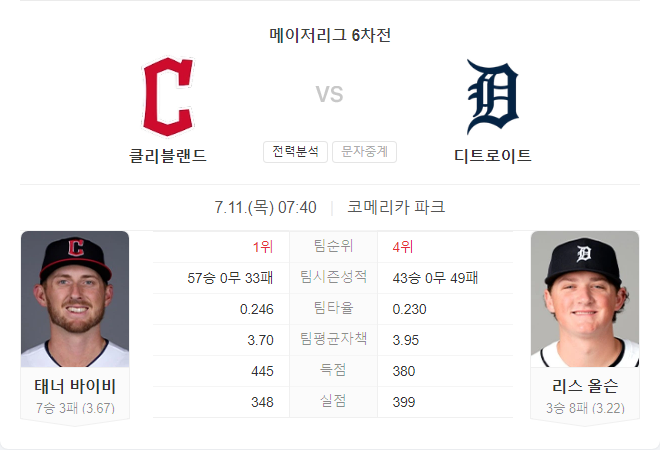 클리블랜드 가디언스는 이번 경기에서 디트로이트 타이거즈를 상대로 승리를 거둘 가능성이 높습니다. 타너 비비는 시즌 내내 안정적인 투구를 보여주고 있으며, 클리블랜드의 강력한 타선이 디트로이트의 투수진을 공략할 것으로 예상됩니다. 반면, 디트로이트 타이거즈는 리스 올슨이 좋은 성적을 거두고 있지만, 팀 전체적으로는 클리블랜드를 상대하기에 어려움이 있을 것으로 보입니다.