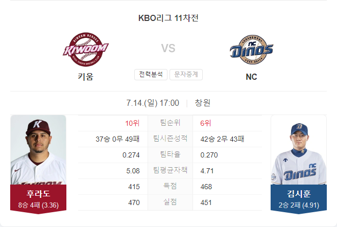 오는 14일 경기에서는 키움 히어로즈의 후라도와 NC 다이노스의 김시훈이 선발 투수로 나섭니다. 후라도는 이번 시즌 8승 4패, ERA 3.36을 기록하며 안정적인 투구를 이어가고 있습니다. 반면, 김시훈은 2승 2패, ERA 4.91을 기록 중이며, 선발과 구원을 오가며 다소 기복 있는 모습을 보이고 있습니다. 후라도는 최근 4경기 연속 퀄리티 스타트를 기록하며 안정적인 투구를 이어가고 있어, 키움 히어로즈가 이번 경기에서 승리할 가능성이 높습니다. 반면, NC 다이노스는 최근 타선이 좋은 활약을 보이고 있어 경기 결과는 쉽게 예측할 수 없습니다.