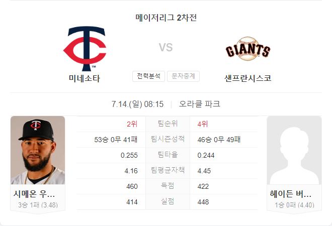 미네소타 트윈스는 시미언 우즈 리처드슨의 안정적인 투구와 강력한 타선을 바탕으로 샌프란시스코 자이언츠를 상대로 승리할 가능성이 높습니다. 우즈 리처드슨은 최근 좋은 투구를 이어가고 있으며, 트윈스의 타선은 이번 시즌 홈런 114개로 메이저리그 5위에 랭크되어 있습니다. 반면, 샌프란시스코 자이언츠는 신인 투수 버드송이 등판하지만, 팀의 공격력과 불펜이 부족해 어려움을 겪을 수 있습니다.
