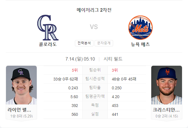 7월 14일 MLB 콜로라도 로키스 VS 뉴욕 메츠 타카짱의 경기 예측 분석
