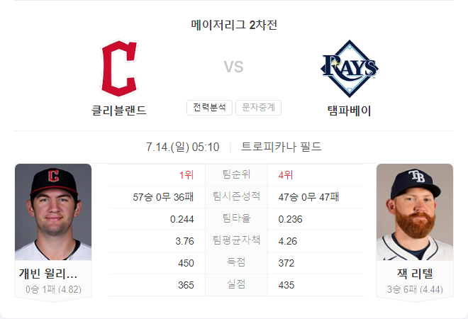 7월 14일 MLB 클리블랜드 가디언스 VS 탬파베이 레이스 타카짱의 경기 예측 분석