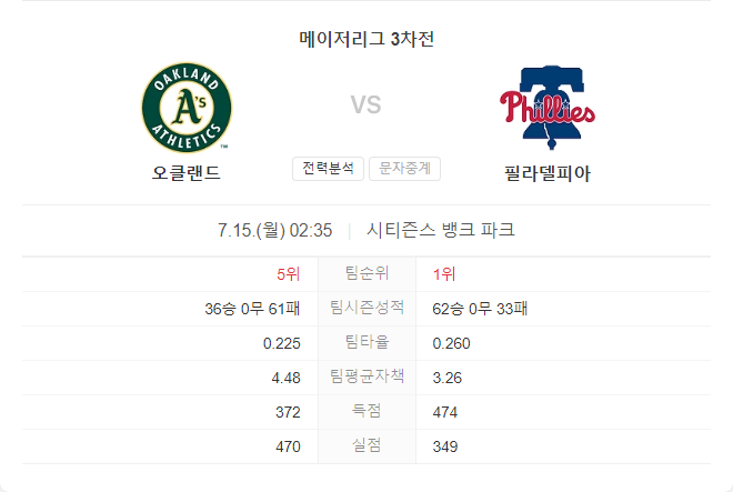 7월 15일 MLB 오클랜드 어슬레틱스 VS 필라델피아 필리스 타카짱의 경기 예측 분석