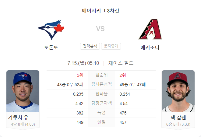7월 15일 MLB 토론토 블루제이스 VS 애리조나 다이아몬드백스 타카짱의 경기 예측 분석
