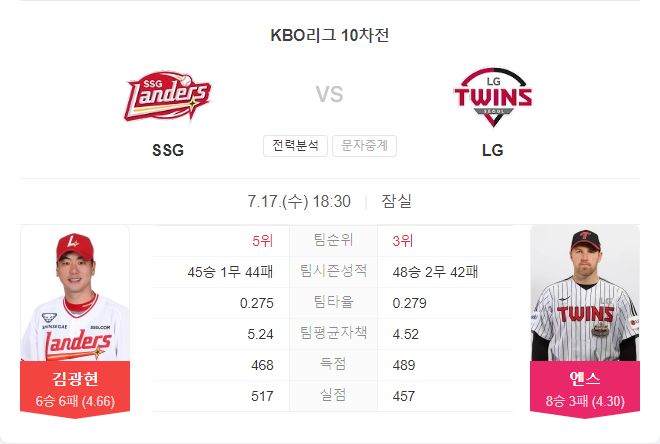 이번 경기는 치열한 투수전이 예상됩니다. 두 팀 모두 뛰어난 선발 투수를 앞세워 경기에 임하지만, LG 트윈스의 엔스가 조금 더 안정적인 성적을 보이고 있습니다. SSG 랜더스의 김광현은 중요한 순간에 강한 모습을 보일 가능성이 높지만, 엔스는 이번 시즌 꾸준히 좋은 성적을 기록하며 팀의 승리를 이끌어왔습니다. 전체적인 전력에서는 LG 트윈스가 약간 더 유리한 위치에 있습니다.