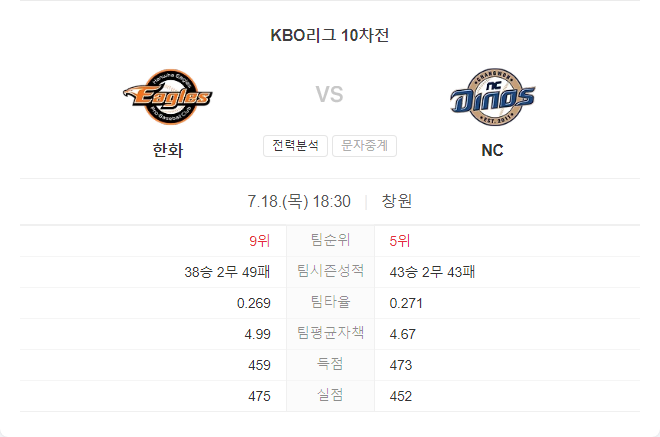 한화 이글스와 NC 다이노스의 경기는 양 팀 모두 강력한 전력을 보유하고 있어 치열한 승부가 예상됩니다. 한화 이글스는 안정된 투수진을 바탕으로 상대 타선을 압박할 것이며, NC 다이노스는 강력한 타선을 바탕으로 득점을 노릴 것입니다. 양 팀의 최근 성적과 선수들의 컨디션을 고려할 때, 이번 경기는 접전이 예상되며, NC 다이노스가 근소한 차이로 승리할 가능성이 높습니다.
