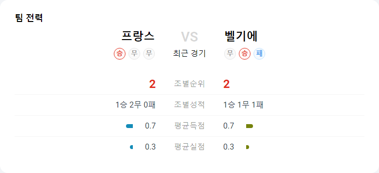 두 팀의 최근 맞대결에서도 프랑스가 우위를 보였으며, 특히 2018년 월드컵 준결승에서 1-0으로 승리한 바 있습니다. 따라서 이번 경기에서도 프랑스가 승리할 가능성이 높습니다.