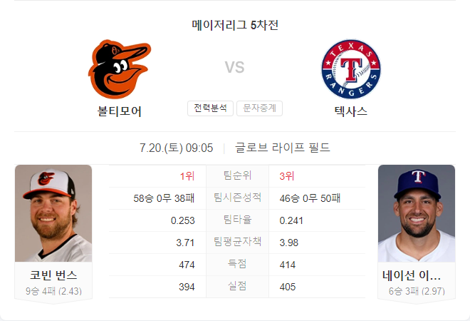 이번 경기에서는 볼티모어 오리올스가 유리할 것으로 보입니다. 코빈 번즈의 안정적인 투구와 팀의 강력한 공격력을 바탕으로 텍사스 레인저스를 상대로 우세를 점할 가능성이 큽니다. 반면, 텍사스는 존 그레이의 불안한 투구와 공격력의 부진으로 인해 어려움을 겪을 수 있습니다. 따라서 오리올스의 승리가 예상됩니다.