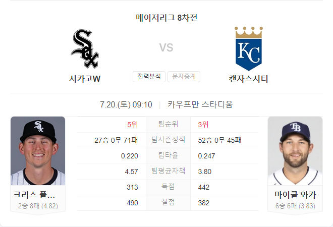 캔자스시티 로열스는 52승 45패로 AL 중부 지구에서 좋은 성적을 거두고 있습니다. 타격 면에서 팀은 중상위권에 위치해 있으며, 출루율(.306), OPS(.712), 홈런(101개), 타점(429개) 모두 준수한 성적을 보이고 있습니다. 이번 경기에 선발 등판하는 마이클 와카는 시즌 6승 6패, 평균자책점 3.83을 기록하고 있으며, 시카고 화이트삭스를 상대로 두 차례 등판해 좋은 성적을 거두었습니다.