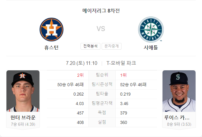 시애틀 매리너스는 루이스 카스티요를 앞세워 홈에서 승리를 노릴 것으로 보입니다. 카스티요는 최근 좋은 성적을 거두었고, 애스트로스의 주요 타자인 카일 터커가 부상으로 출전하지 못하는 상황이기 때문에 시애틀이 유리한 위치에 있습니다. 휴스턴 애스트로스의 헌터 브라운도 좋은 성적을 거두었지만, 카스티요와의 매치업에서 우위를 점하기 어려울 것입니다.