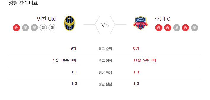 7월 21일 K리그 인천 VS 수원 타카짱의 경기 예측 분석