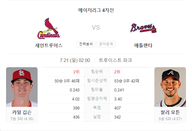 세인트루이스 카디널스와 애틀랜타 브레이브스의 경기는 치열한 승부가 예상됩니다. 카디널스는 최근 경기에서 다소 부진했으나, 강력한 타선을 보유하고 있습니다. 반면, 브레이브스는 최근 경기에서 좋은 성적을 보였으며, 찰리 모튼의 안정적인 피칭이 기대됩니다. 양 팀의 최근 성적과 선수들의 컨디션을 고려할 때, 이번 경기는 애틀랜타 브레이브스가 조금 더 우세할 것으로 보입니다.