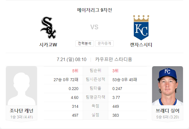 시카고 화이트삭스는 이번 시즌 극심한 부진을 겪고 있습니다. 현재 27승 71패로 리그 최하위권에 머물고 있으며, 원정 경기에서는 10승 37패로 특히 약한 모습을 보이고 있습니다. 이번 경기에서는 신예 투수 조나단 캐논이 선발 등판합니다. 캐논은 최근 경기에서 피츠버그 파이어리츠를 상대로 6이닝 동안 7안타 4실점을 기록하며 패배했지만, 시즌 평균자책점 4.41, WHIP 1.31로 다소 안정적인 성적을 유지하고 있습니다. 캔자스시티 로열스를 상대로는 이번 시즌 한 차례 맞대결에서 5이닝 1실점으로 호투한 바 있습니다.
