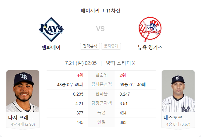 탬파베이 레이스는 올스타 휴식기 이후 첫 시리즈에서 뉴욕 양키스를 맞이합니다. 올스타 브레이크 전 마지막 시리즈에서 클리블랜드를 상대로 2-0 승리를 거두며, 최근 4경기 중 3경기를 승리로 장식했습니다. 현재 48승 48패로 아메리칸리그 동부지구 4위에 자리하고 있으며, 와일드카드 경쟁에서도 보스턴 레드삭스와 5.5게임 차이를 보이고 있습니다. 이번 경기에서는 타지 브래들리가 선발로 나서며, 시즌 성적은 4승 4패, 평균자책점 2.90을 기록 중입니다. 브래들리는 최근 3경기에서 2승 0패, 평균자책점 0.48로 뛰어난 성적을 보이고 있습니다.
