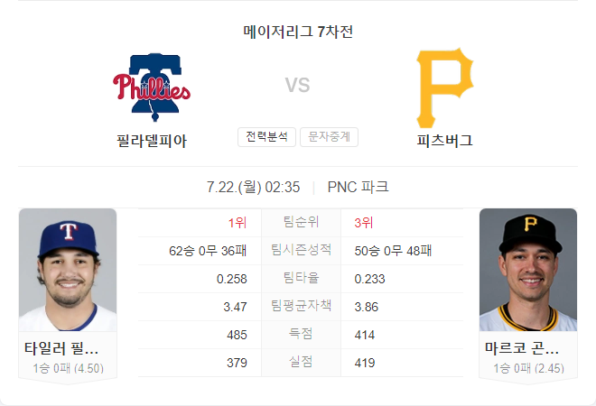 필라델피아 필리스는 현재 62승 36패로 내셔널리그 동부지구 1위를 달리고 있지만, 최근 3연패를 기록하며 다소 주춤한 모습을 보이고 있습니다. 이번 경기에 선발로 나서는 타일러 필립스는 시즌 초반부터 어려움을 겪고 있으며, 최근 두 경기에서 10이닝 동안 5실점을 기록하였습니다. 필리스는 경기당 평균 4.99득점을 기록하며 강력한 타선을 자랑하지만, 필립스의 부진이 이번 경기에서 변수로 작용할 수 있습니다.