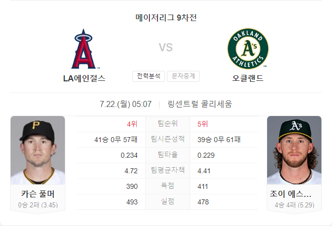 이번 경기는 양 팀의 타격 부진과 투수진의 불안정이 맞물려 접전이 예상됩니다. 오클랜드 어슬레틱스는 최근 LA 에인절스를 상대로 좋은 성적을 거두고 있으며, 홈 경기에서도 강한 모습을 보이고 있습니다. 에스테스가 최근 LA를 상대로 좋은 투구를 펼쳤기 때문에 이번 경기에서도 유리한 고지를 점할 가능성이 큽니다.
