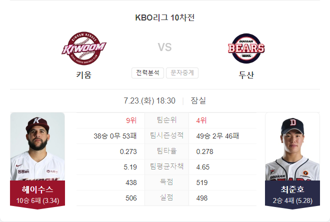 올 시즌 키움 히어로즈는 두산 베어스를 상대로 승률 0.223을 기록하며 약한 모습을 보였지만, 최근 두산 불펜진의 부진을 고려할 때 이번 경기는 키움에게 유리할 것으로 보입니다. 특히 두산에 강한 모습을 보였던 헤이수스가 선발로 나서기 때문에, 키움 히어로즈가 승리를 거둘 가능성이 높습니다.