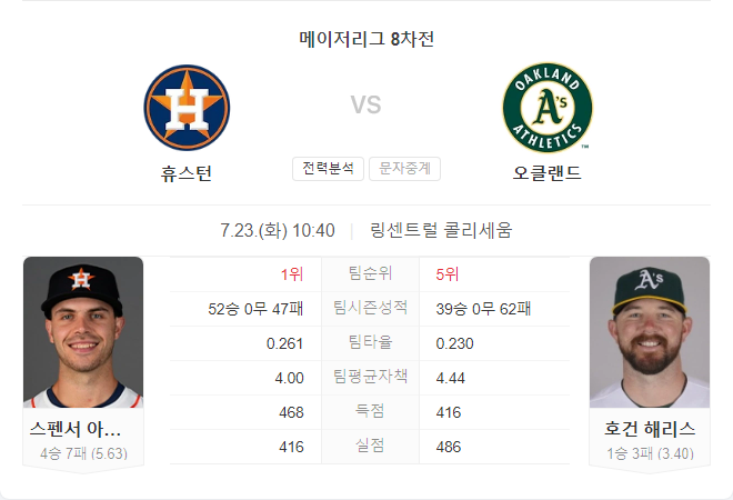 휴스턴 애스트로스는 최근 좋은 성적을 기록하며 AL 서부 지구 선두를 유지하고 있습니다. 스펜서 아리게티는 최근 경기에서 안정적인 투구를 펼쳤으며, 요단 알바레즈의 타격감이 좋아 기대를 모으고 있습니다. 반면, 오클랜드 어슬레틱스는 최근 상승세를 타고 있지만, 해리스가 휴스턴 타선을 막기에는 어려움이 있을 것으로 예상됩니다. 휴스턴이 이 경기를 승리할 가능성이 높습니다.