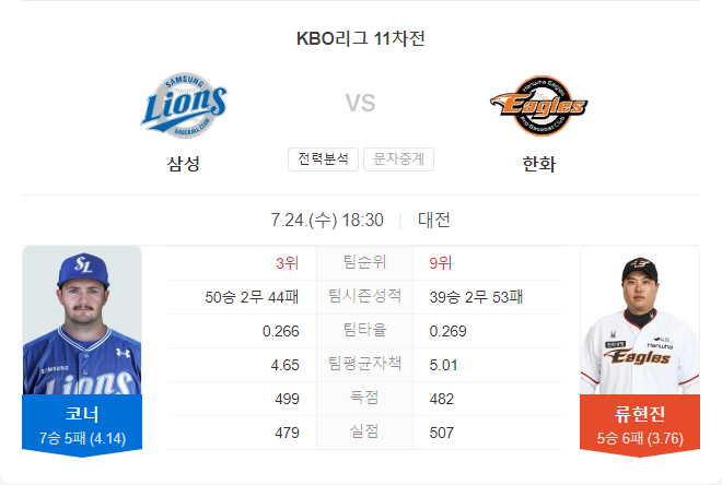 한화 이글스는 이번 시즌 평균자책점 4.55, 타율 0.280, 평균 득점 5.0점, 평균 실점 4.5점으로 공격력은 좋지만 투수진에서 다소 불안한 모습을 보이고 있습니다. 선발투수 류현진은 시즌 5승 6패, 평균자책점 3.76, WHIP 1.30을 기록하고 있으며, 주로 직구(43.9%)와 체인지업(24.7%)을 사용합니다. 류현진은 삼성과의 맞대결에서 1승을 기록한 바 있습니다.