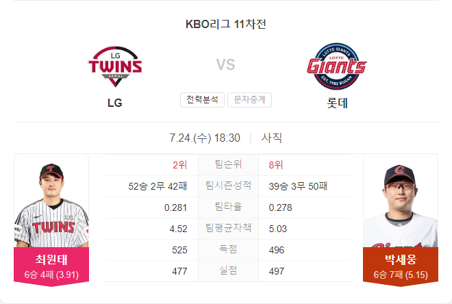 7월 24일 KBO 프로야구 LG 트윈스 VS 롯데 자이언츠 타카짱의 경기 예측 분석